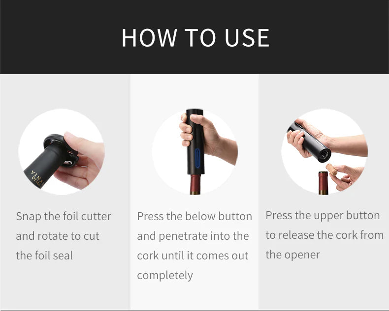 Električni otvarač za vino Otvorite bocu vina za nekoliko sekundi jednim pritiskom na dugme. Providno kućište omogućava da vidite uklanjanje čepa, dok ergonomski dizajn olakšava korišćenje svima. Radi na 4 AA baterije (nisu uključene).