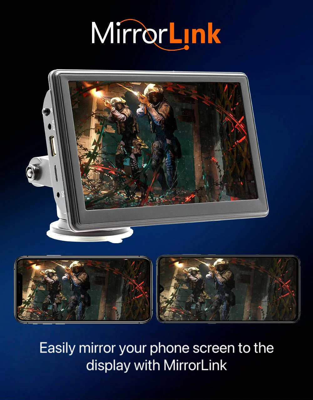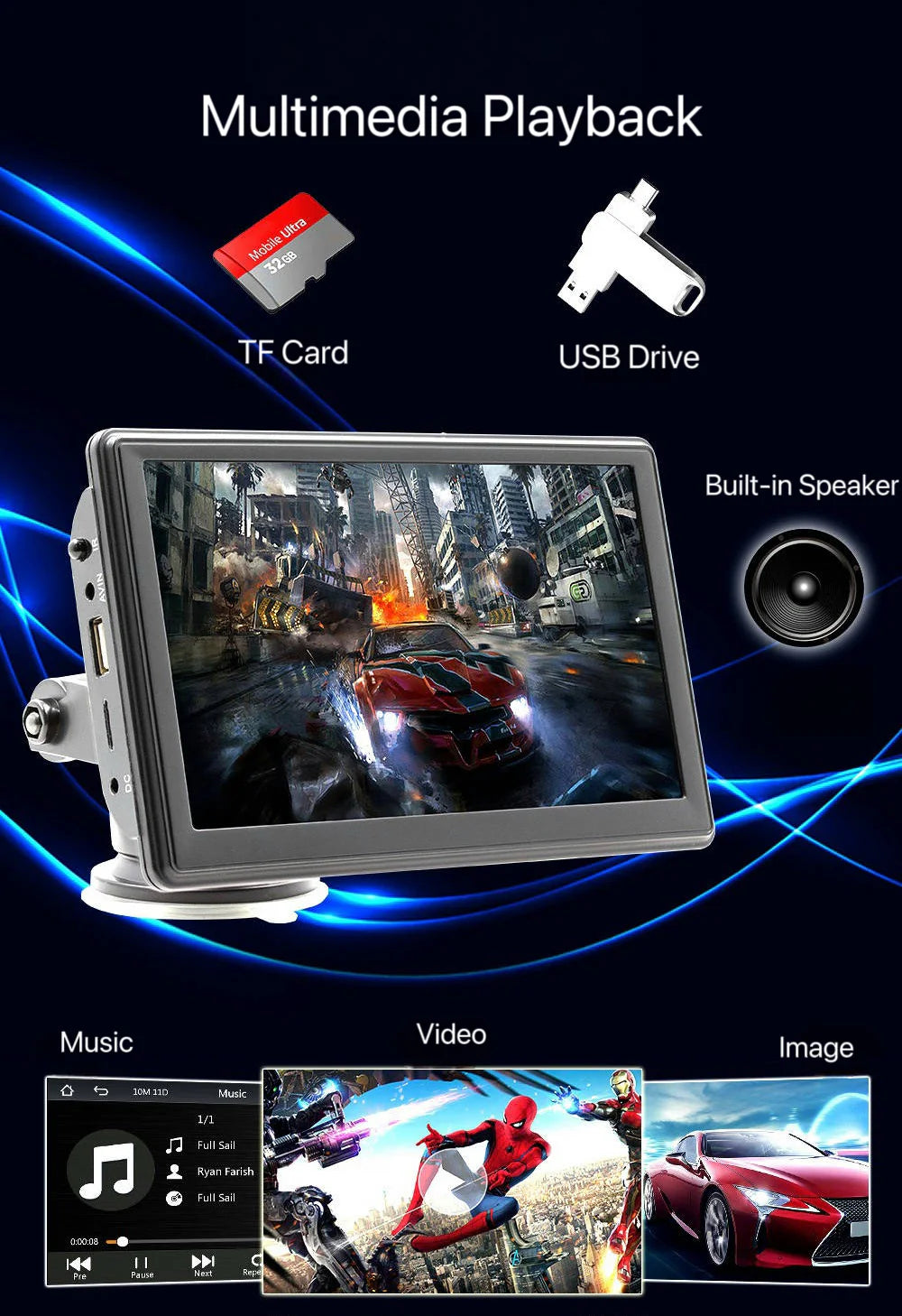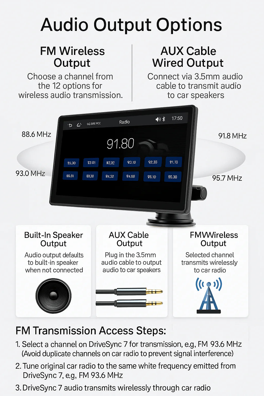 Uređaj poseduje ugrađeni zvučnik, ali se može lako povezati i sa fabričnim ozvučenjem automobila putem AUX kabla za još bolji kvalitet zvuka.